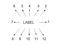 This diagram is but a rough sketch of the positions. For example, if position 4 is requested, the the label will appear under the arrow; if position 3 is requested, then the arrow will be on a line that goes through the center of the label at an angle of 67.5 degrees, and so forth.