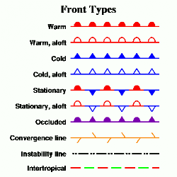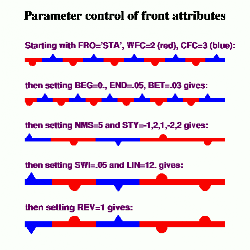 It is possible to specify the exact sequence in which warm front and cold front symbols appear along a front line, as well as which side of the line they point. The internal parameter array STY is used for this purpose. The legal values for elements of the STY array are plus or minus 1 and plus or minus 2. A "1" will produce a cold front symbol (a small triangle) and a "2" will produce a warm front symbol (a semi-circular bump). The algebraic sign of the elements of STY indicate what side of the front line the symbols will point - a positive value will cause the symbol to point to the right of the line (as traversed from the start to the end), and a negative value will cause the symbol to point to the left. Elements of the STY array are defined by using the internal parameter PAI to indicate which element is being specified and then providing a value for STY. The internal parameter REV can be used to reverse the directions that the symbols along a front line point.