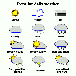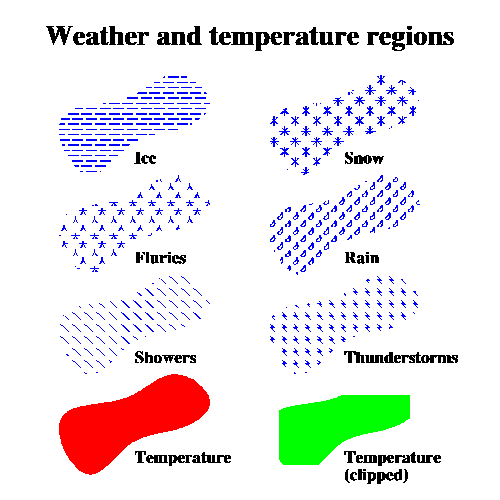| NTYPE = 1 | Plot the legend for the weather types. There are six weather types: showers; T-storms; rain; flurries; snow; ice. The coordinate (X,Y) for this type specifies the lower left corner of the legend. |