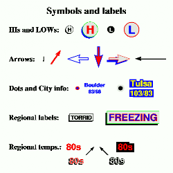 For examples of plotting city names, hi/low data, and dots, see Figures 6, 13, and 14 in Appendix A.