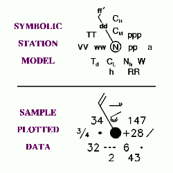 The internal parameters that control the appearance of wind barbs apply to the wind barbs that are part of the station model display. See the section Wind Barbs for details on wind barbs. In addition to the wind barb parameters, the parameters WBC and WBL apply to the station model display. WBC specifies the diameter of the sky cover circle at the base of the wind barb and WBL specifies the size of the text labels in the station model display.