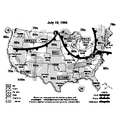 The functionality of the package, and the documentation, is broken into: plotting front lines; plotting regions showing weather type or temperature zone; plotting city names and daily high/low temperature readings; plotting regional weather labels (like "BREEZY," "HUMID," and so forth); plotting regional temperature labels with optional arrows; plotting special symbols (like ones for high and low pressure) and icons representing daily weather; plotting map legends; plotting wind barbs and station model data.